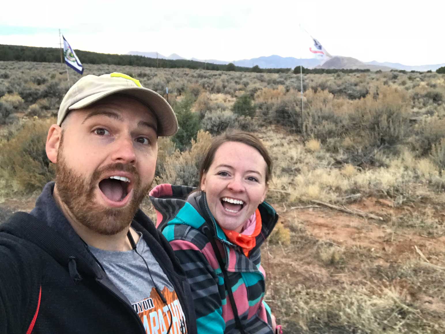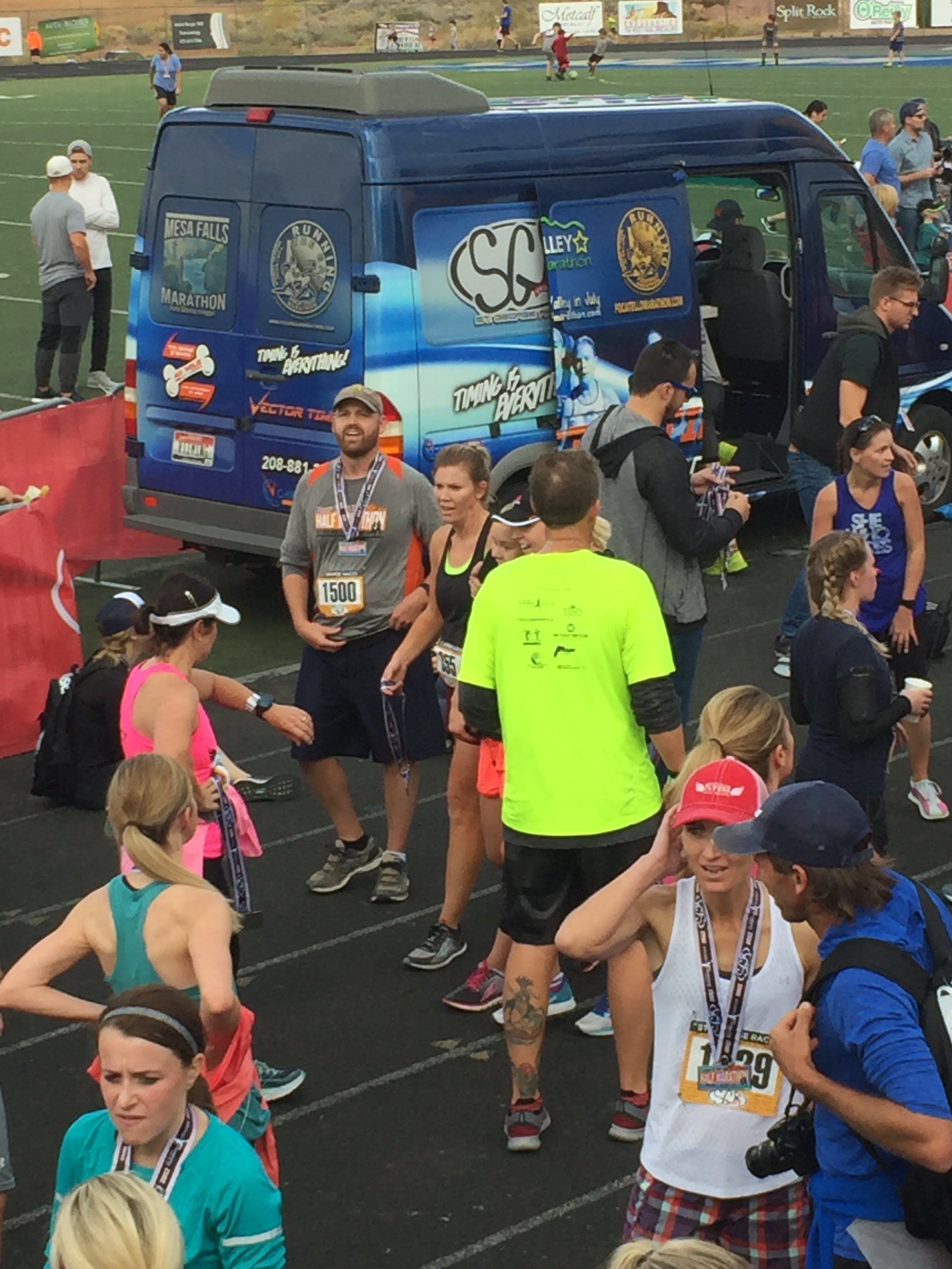 Here comes the race day. It’s a beautiful rainy day in St. George. We get on the bus, I’m with my sister and brother in law. Both have ran marathons for years. We jump on a bus at about an hour before the butt crack of dawn and up towards Enterprise we go. We pass the drop off from the year before that was the half marathon and keep driving. We go do the steepest hill, at the bottom in a pie shop and we keep driving for another 7-miles to the starting point. It occurred to me that I had not trained any hills and 7-miles in to the run, I’m going to running up a nearly mile long steep hill. I was scared.